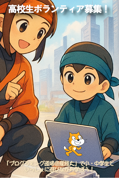 「プログラミング道場@産経大」で、ロボット・Scratchで楽しく活動する子どもたち(小中学生)をサポートしてくれる高校生ボランティアを募集します。